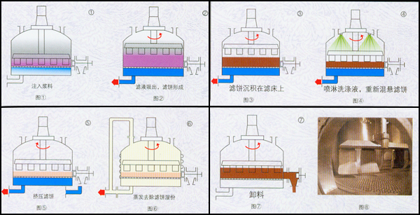 6、清洗徹底:由于此設備具有自動噴淋和重新打漿的功能,濾餅可以得到非常徹底的清洗。并且洗滌液用量較其它類型設備少,可減少排污量和降低廢水處理費用。