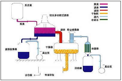 4、操作連續(xù):能夠使過濾和干燥在一個連續(xù)的系統(tǒng)內進行,毋須處理濕濾餅。在過濾器下可以連接一個干燥器,使?jié)駷V餅直接卸入干燥器,干燥后的產品可以機械傳送至稱量、包裝等工段。